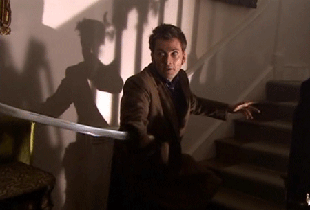 It wasn’t too long into the episode, though, before it became clear that that was not what was going on — or anything like that, either — but kudos to Davies for making us wonder for quite a while. Morrissey’s “Doctor” is not consciously faking being the Doctor, so he’s not a gamer… could he really be a future Doctor? I thought there was a good chance that he was… and what a magnificent bastard Davies would again prove himself to be if, while we’re all debating who the next Doctor should be, Morrissey’s already been cast and it’s a done deal. That could have been very interesting indeed: We’ve only ever seen the Doctor meeting past incarnations of himself, and here could have been a chance — speaking from the logistical perspective of actually producing a regular TV series — to do it the other way around. The Doctors meet here, then Ten goes off to have a few more adventures, and all the while, he knows this regeneration is dangling in front of him in the near future. We’re all already heartbroken over Tennant’s imminent departure, but this could have made his final episodes all the more poignant for his character as well as for his audience.