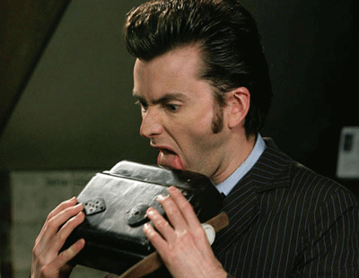 I myself am more disturbed by the constant and blatant “the Doctor continues not to come to my house and steal me away from this rock” agenda that the show keeps throwing in my face. Because I can’t avoid acknowledging, no matter how much commentary on contemporary social realities I can finagle out of an episode, that it’s simply all about the Doctor for me. I’m in love with him — all of him, not just David Tennant’s Doctor, except that he happens to be the Doctor at the moment. The Best. Doctor. Evar., of course, but I’ve pretty much thought that about all of them at the time, kind of. So I don’t care if he wears a silly pompadour hairdo that I would have to tell him, were I traveling with him at this time, that he really shouldn’t bother with again. I would forgive him thinking he’s landed the TARDIS in New York when we are quite obviously in London. I would love him even more for standing up to all kinds of bullies, even one so minor as Eddie (at least in comparison to, say, Davros), and for throwing a touch of feminist outrage into a pre-Betty Friedan era (“Mr. Connolly, what gender is the queen?”). I might be mystified to hear him say, “I love telly, don’t you?” but then again, if I were traveling on the TARDIS, I’d know why the hell he has a Betamax VCR, and what he’ll tape over the Wire with. Perhaps an episode of The Wire?