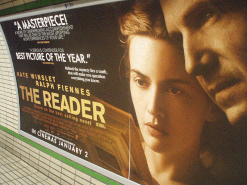 I don’t seem to remember the ads in NYC for The Reader seeming to suggest, as this one does, that the young Kate Winslet appears onscreen with Ralph Fiennes. (She doesn’t — she’s onscreen with him only in old-lady makeup.) But maybe I’m wrong. I’ll have to pay attention when I get home:
