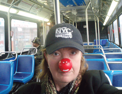 I’m wearing my Red Nose Day red nose all over NYC, making myself look like a fool in public, to raise money to fight poverty all over the world. And here I am on a New York City bus.