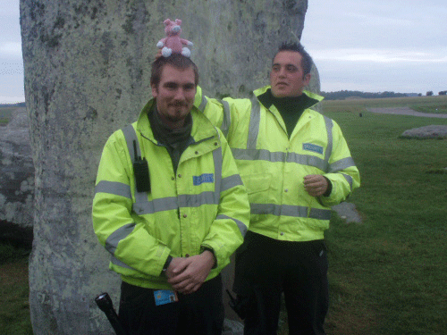 They found Nigel (and, I daresay, the crazy Yank broad who asked if they would pose with him) far more entertaining than the chanting pseudo-Buddhist pagans chanting in the circle for the hour we had within it. (Who were, by the way, entirely different chanting pagans than the ones Bonnie and I encountered there last year.) After the first photo in the parking lot, they were asking to play with Nigel. Not that they weren’t doing their job of guarding the circle or anything, I hasten to add, lest their bosses read this. They were most professional indeed. They just liked Nigel.