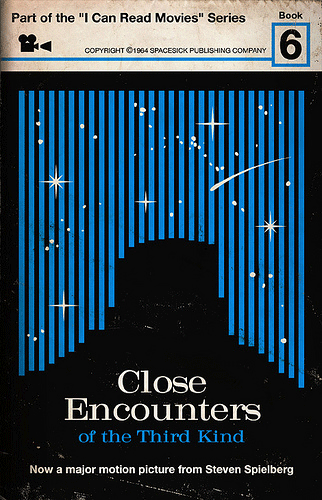 Artist spacesick — whose work I’ve highlighted before — has created a series of faux retro covers for novels that don’t exist for movies that do. Like this on for Close Encounters of the Third Kind: