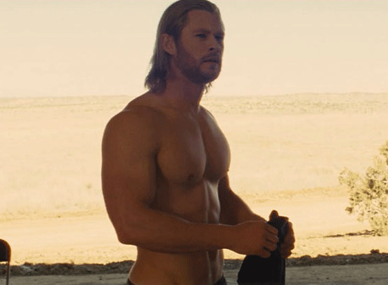 This is just after Thor has arrived on Earth and been picked up — pun intended — by scientist Natalie Portman and her assistant, Kat Dennings. I was struck by this scene for how female-gazey it is: Dennings can’t take her eyes off Thor (as he changes into Earthly clothing), she’s that taken with his masculine beauty. It’s not that often that any film, never mind a big-budget Hollywood comic-book action flick, takes the time to linger over the physical attractiveness of a man in the eyes of a woman character onscreen. Kudos to director Kenneth Branagh — obviously a straight man comfortable and confident in his sexuality — for this. And a thank-you, too, because Hemsworth is indeed pretty yummy.