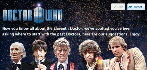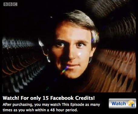 Each story costs 15 Facebook credits ($1.50 / £.93, though you can get FB credits cheaper if you buy credits in bulk), which isn’t much. However, if you’re a Netflix customer in the U.S., a much more comprehensive selection of Doctor Who — including all but the very latest episodes of the new series and pretty much all the old shows that are on DVD — are available to stream for free as part of your monthly subscription. (I’d be curious to hear if that’s also the case for Netflix’s streaming customers in Canada.)