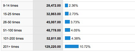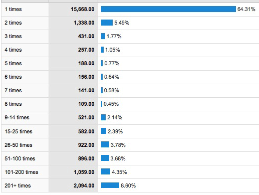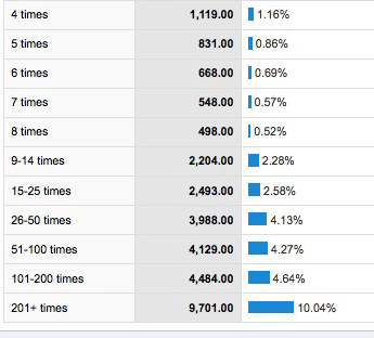 • 52,811 visits that were somewhere between the 101st and 200th visit for that visitor (or, on average: 522 readers who stopped by here twice per week and 264 readers who stopped by here four times per week)