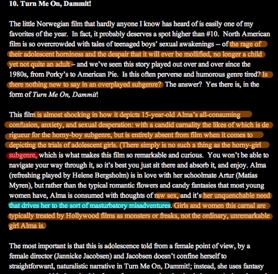 Here’s my review of Turn Me On, Dammit! Lianne Spiderbaby’s is here. And just in case she decides to edit it, here’s the screenshot I took this morning, with the passages that have been lifted directly from my review highlighted: