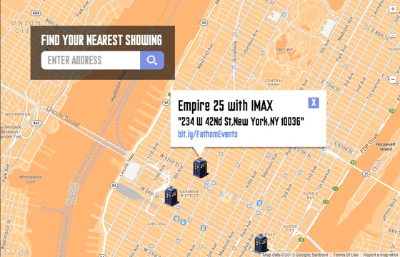 Taking a little break from the New York Comic-Con photos series (there will be more next week) to let you know that tickets for the multiplex screenings of the 50th-anniversary episode, “The Day of the Doctor,” have now gone on sale. The episode will screen in 3D in cinemas across the U.K., North America, Australia, and New Zealand. I imagine other regions will have some screenings, too, but those areas are what’s showing up right now at the BBC’s interactive cinema finder for the event. Just plug in your address, and you’ll get the theaters near you participating, along with a link for purchasing tickets.