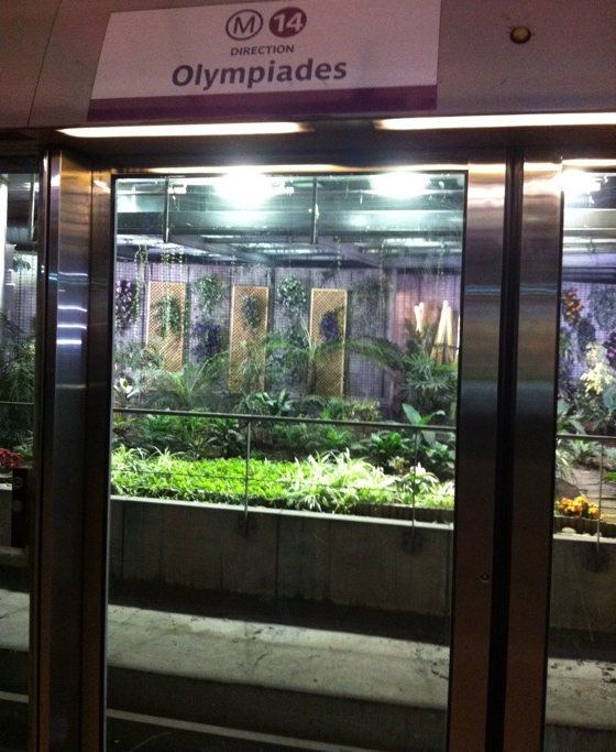 And this is the other, erm, interesting Metro station I saw. Bercy on the No. 14 line is like what will happen once we’re all living deep underground to escape whatever doom befell us and we’re going crazy from the lack of color, so for the sake of our collective sanity, we created a fake garden so we can pretend that everything is just fine.
