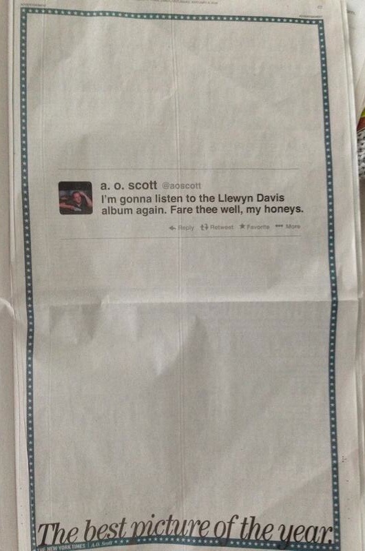 • I don’t understand why everyone is so surprised about this. It’s better than using a random tweet from some dude who sees one movie every six months and just tweeted about the “best movie of the year!” (which the studios are already doing). At least they quoted A.O. Scott, a respected critic. “’Inside Llewyn Davis’ Uses Single Tweet in Full Page New York Times Ad” [The Wire]