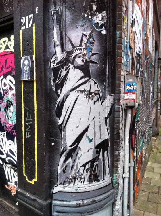 That means “Miss” Liberty. No idea what moved someone to paint her on an Amsterdam street corner.