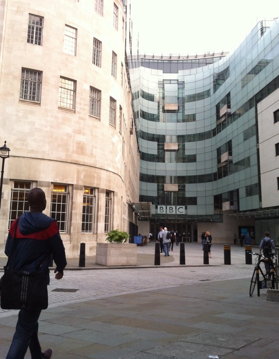 So that gorgeous Art Deco building I featured yesterday, the old BBC London HQ? Here’s the new glass extension. It’s also quite beautiful, if in a more modern way — I should try to get a picture of it at night, when it glows blue.