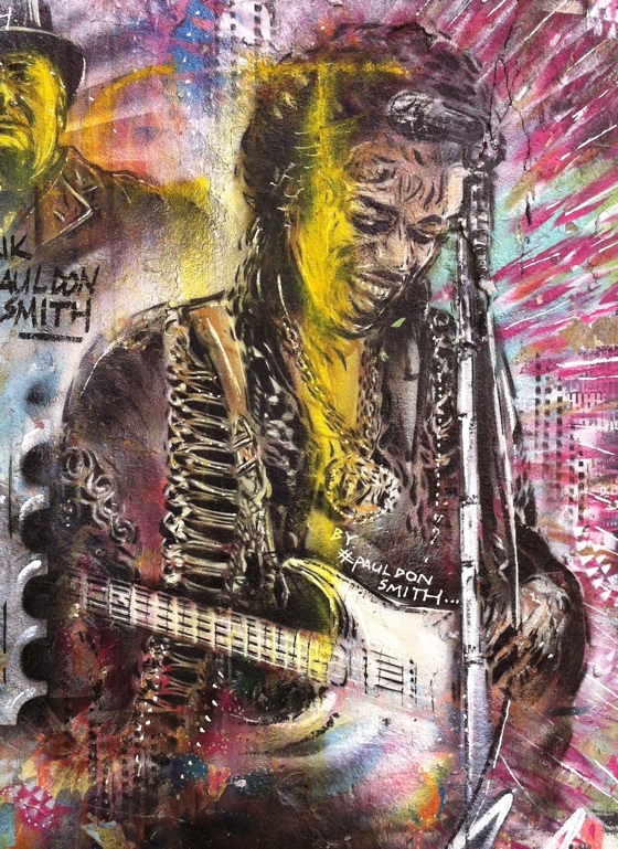 Monday’s very tall graffiti soldier was actually standing high up on a wall above another batch of street art. Here’s another section of it. (Click here for a larger version.) Jimi Hendrix is dead — long live Jimi Hendrix. (In Spitalfields.)