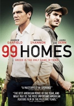Ramin Bahrani (Man Push Cart, Goodbye Solo) is the best American filmmaker working today whom you’ve never heard of, but perhaps that will change with 99 Homes, his most mainstream — and most insistently pertinent — movie yet. Andrew Garfield (happily getting back to his social-realist indie roots; Spider-Man does not suit him) is Dennis Nash, an out-of-work Orlando construction worker whose home is repossessed via realtor Rick Carver (Michael Shannon [They Came Together], bringing his usual terrifying intensity)… and while the scene of a stunned, scared Nash family forcibly removed from their home is gut-wrenching, it’s nothing to what comes next, as Dennis finds that the only work available, the only thing that might allow him to get his house back, is working for Carver’s house-repo business. (Dennis’s little family includes his gradeschooler son [Noah Lomax: Safe Haven] and his mother, played by Laura Dern [Wild], who is too young for the role but who is always a joy to spend time with.) A horror story of today’s economy, this is a dismal, and dismally authentic, portrait of America’s heartless dog-eat-dog culture in which compassion is weakness and maximizing profit is everything, one with a humane appreciation for the despair that drives people like Dennis and Carver to their cruelty and corruption, and a bitter fury for the system that chews them up. “You get numb to it,” Carver insists as Dennis is about to kick another family out of their home. But there is nothing numbing in this brutal film, which leaves us with only rage and anguish.