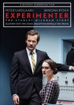 Milgram conducted other, more benign experiments into human behavior, and also discovered the fact that the average person is only six degrees of separation from any other random person, but these studies don’t capture the dark side of our collective imagination or peer into the human psyche the way the electric-shock one does, and it’s that project around which Experimenter is built. Writer and director Michael Almereyda deploys a creepy-cool vibe of constructed cinematic artificiality that echoes the illusory nature of Milgram’s experiment — in which the application of electric shocks, among other aspects, was actually fake — though of course we know from the outset that we are being manipulated (which also echoes a criticism of his project presented here, comparing and contrasting it with a stage play). Peter Sarsgaard (Night Moves, Very Good Girls), as Milgram, frequently speaks directly into the camera to explain himself and his work to us, and the actor takes on a deliberately stilted attitude… which is only underscored as a pose — of the Scientist and the Thinker and the Rational Man — on the few occasions when he slips into warm, poignant humanity, in moments with Milgram’s wife (Winona Ryder: Homefront, Frankenweenie) or his small daughter (Lucy Fava).