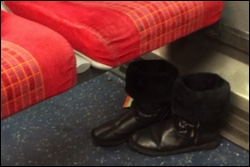 Someone left some (apparently) perfectly good footware on the train. Perhaps the boots misbehaved?