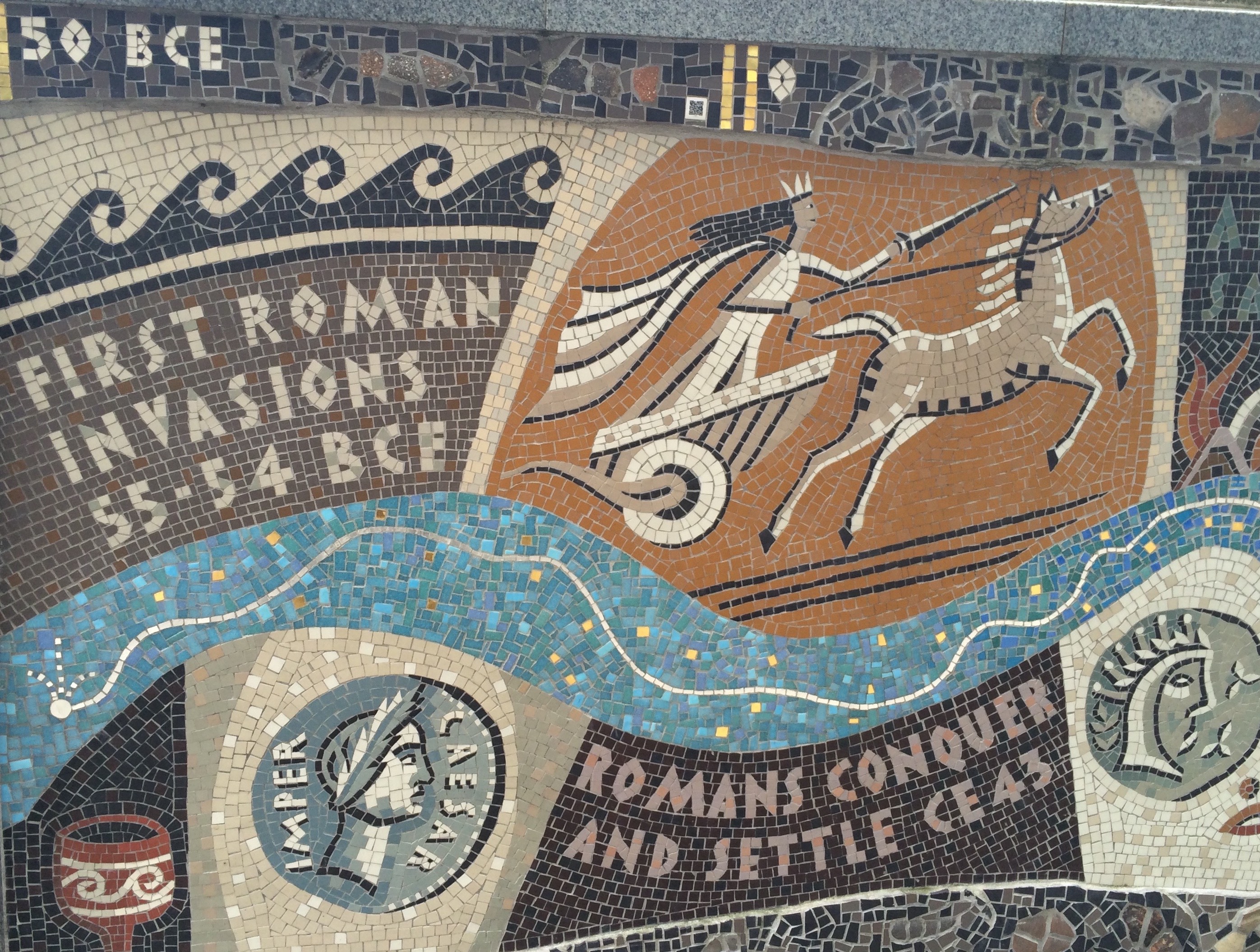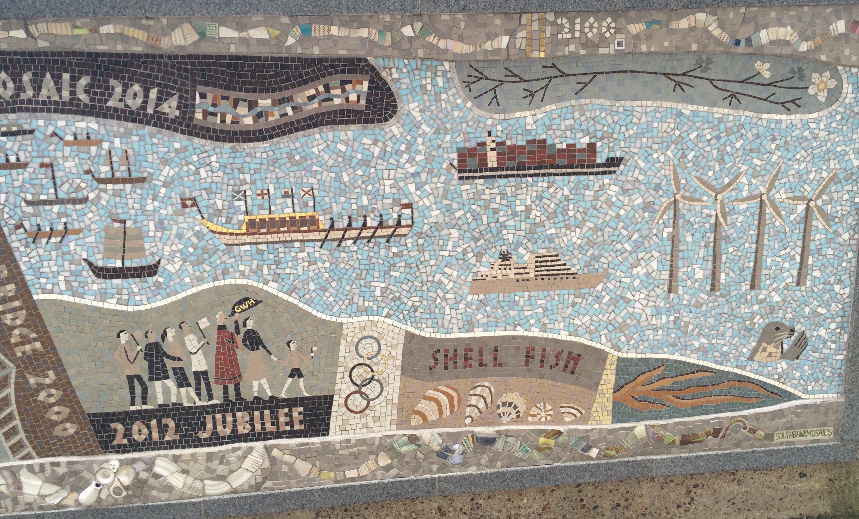 The Queenhithe Mosaic is a newish (circa 2014) installation on the north bank of the Thames, between Southwark Bridge and St. Paul’s Cathedral, on what is apparently the only remaining Anglo Saxon dock on the planet.