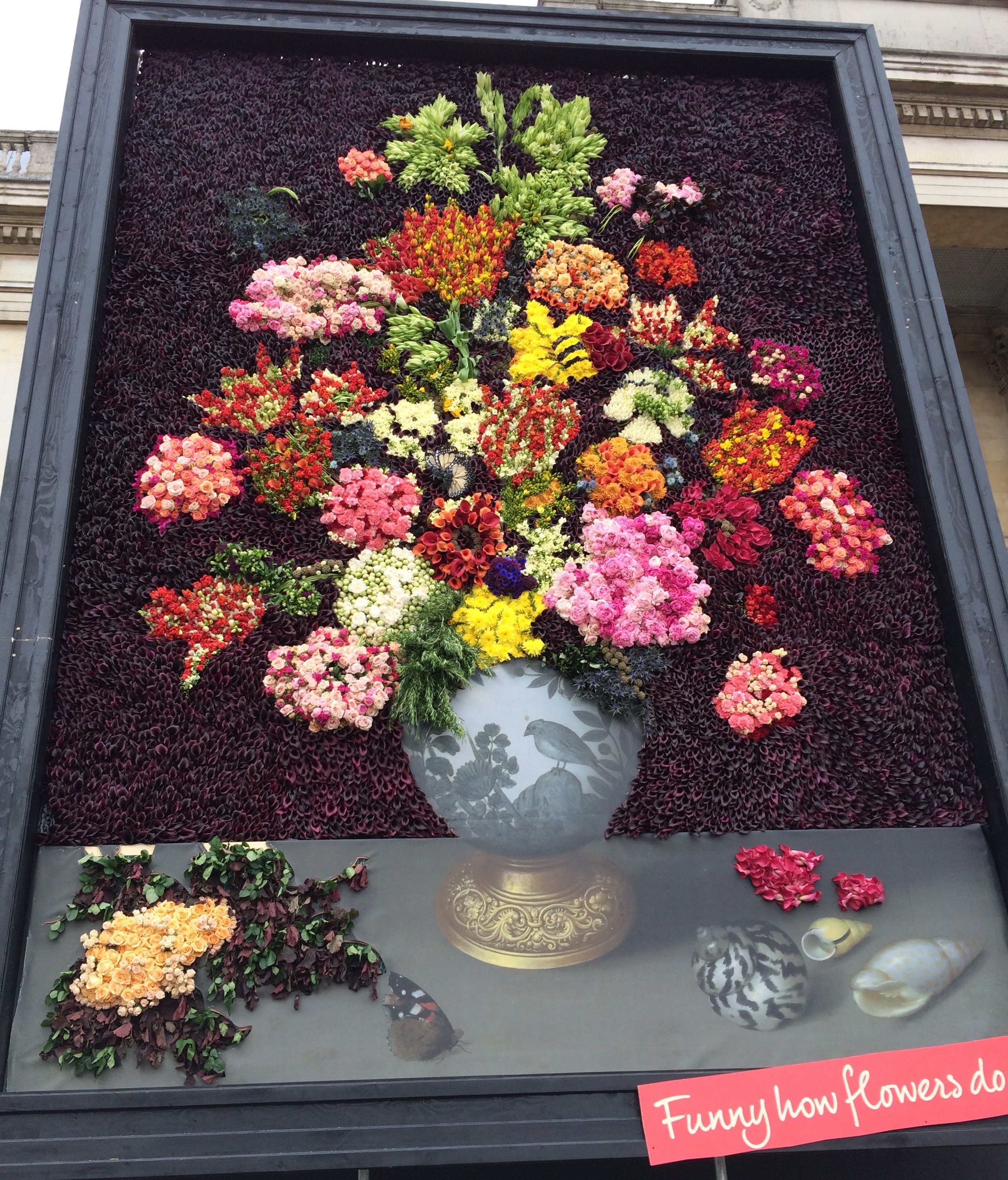 Outside the National Gallery earlier this week, an enormous re-creation of Ambrosius Bosschaert the Elder’s early-17th-century painting “A Still Life of Flowers in a Wan-Li Vase” in real flowers, by Funny How Flowers Do That.co.uk.