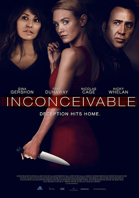 So it is with doctors Brian (Nicolas Cage: Snowden) and Angela (Gina Gershon: P.S. I Love You) when they invite their new friend Katie (Nicky Whelan: The Wedding Ringer) to live in their guest house — with her small daughter Maddie (Sienna Soho Baker) — and to be nanny to their lil tyke Cora (Harlow Bottarini) as they embark upon the unlikely adventure of trying to have another baby… in their 50s. Why is Katie so secretive about her past? Why is she acting so strangely possessive of Cora, to the point of pretending that she is actually Cora’s mother? Why on earth would Brian and Angela agree to let a near-total stranger who sets off so many alarm bells get even more intimately entrenched in their family? (What on earth made Faye Dunaway [The Bye Bye Man] agree to appear in the thankless role of Brian’s scold of a mother?) The answers will startle you only in how preposterous Inconceivable dares to be, to what ridiculous lengths it will go to in its attempts to shock and titillate you.