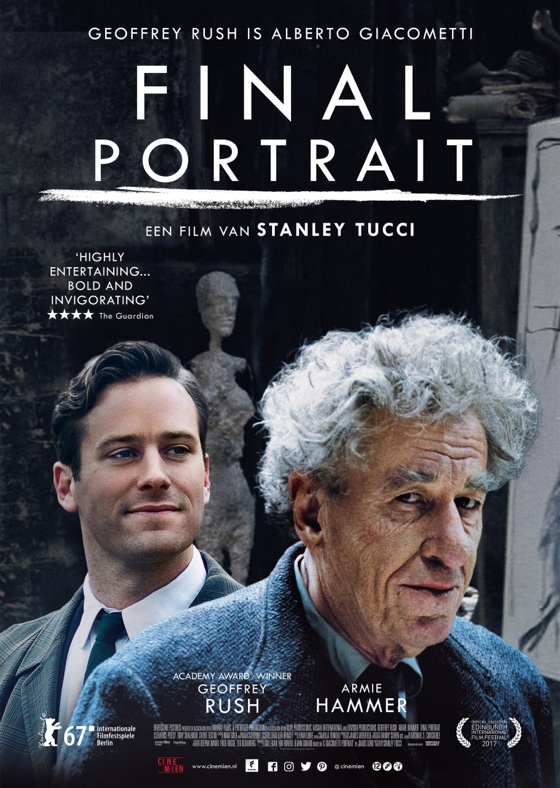 In Paris in 1964, Swiss artist Alberto Giacometti (Geoffrey Rush: Pirates of the Caribbean: Salazar’s Revenge, Gods of Egypt) invites a friend, American journalist James Lord (Armie Hammer: Call Me by Your Name, Cars 3), to sit for a portrait. Lord is about to fly home to New York in a few days, but Giacometti promises that this favor to him will require “two to three hours, an afternoon at the most.”