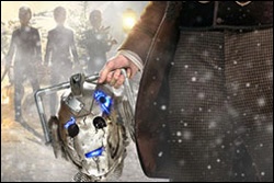 Festive Clara with her paper crown and her cracker + serious Doctor holding a decapitated Cyberman head? Urk.