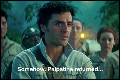 I have chosen the absolute nonsense of “Somehow, Palpatine returned,” which is so ridiculous that poor Oscar Isaac seems unable to muster enough enthusiasm to even pretend it makes sense…